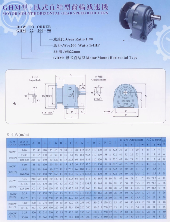 GHM臥式齒輪減速電機(jī)的型號(hào)表示方式,GHM臥式小齒輪減速機(jī)馬達(dá)的外形尺寸表,GHM18,GHM22,GHM32,GHM40,GHM50;75W(1/10HP),100W(1/8HP),200W(1/8HP),400W(1/2HP),750W(1HP),1500W(2HP),2200W(3HP),3700W(5HP)