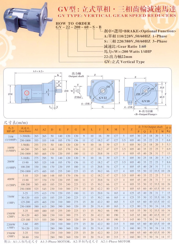 GV立式齒輪減速電機的型號表示方式,GV立式小齒輪減速機馬達的外形尺寸表,具體型號:GV18,GV22,GV28,GV32,GV40,GV50;可配電機功率:75W(1/10HP),100W(1/8HP),200W(1/4HP),400W(1/2HP),750W(1HP),1500W(2HP),2200W(3HP),3700W(5HP)